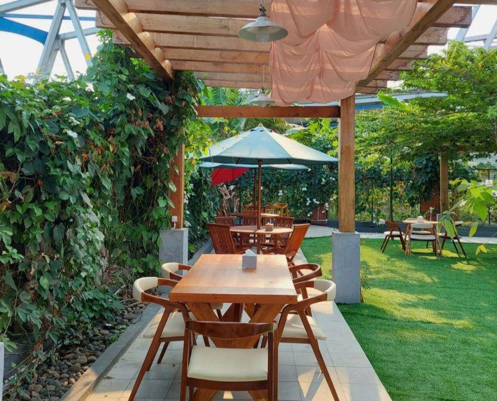 Taman kafe juga tidak kalah menarik, pengunjung masih dimanjakan dengan pemandangan sungai yang diringi dengan hembusan angin dari pepohonan rindang sehingga membuat mereka betah berlama-lama terutama pada senja hari.