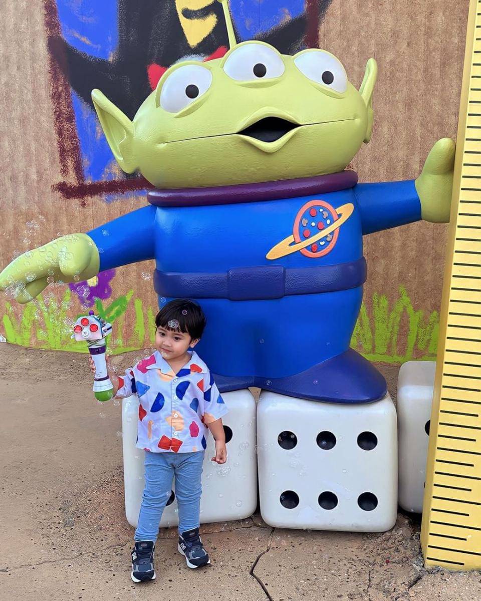9. Tampil playful saat liburan ke Disneyland Hongkong, Ebra kenakan celana jeans dengan kemeja colorful dan sneakers hitam