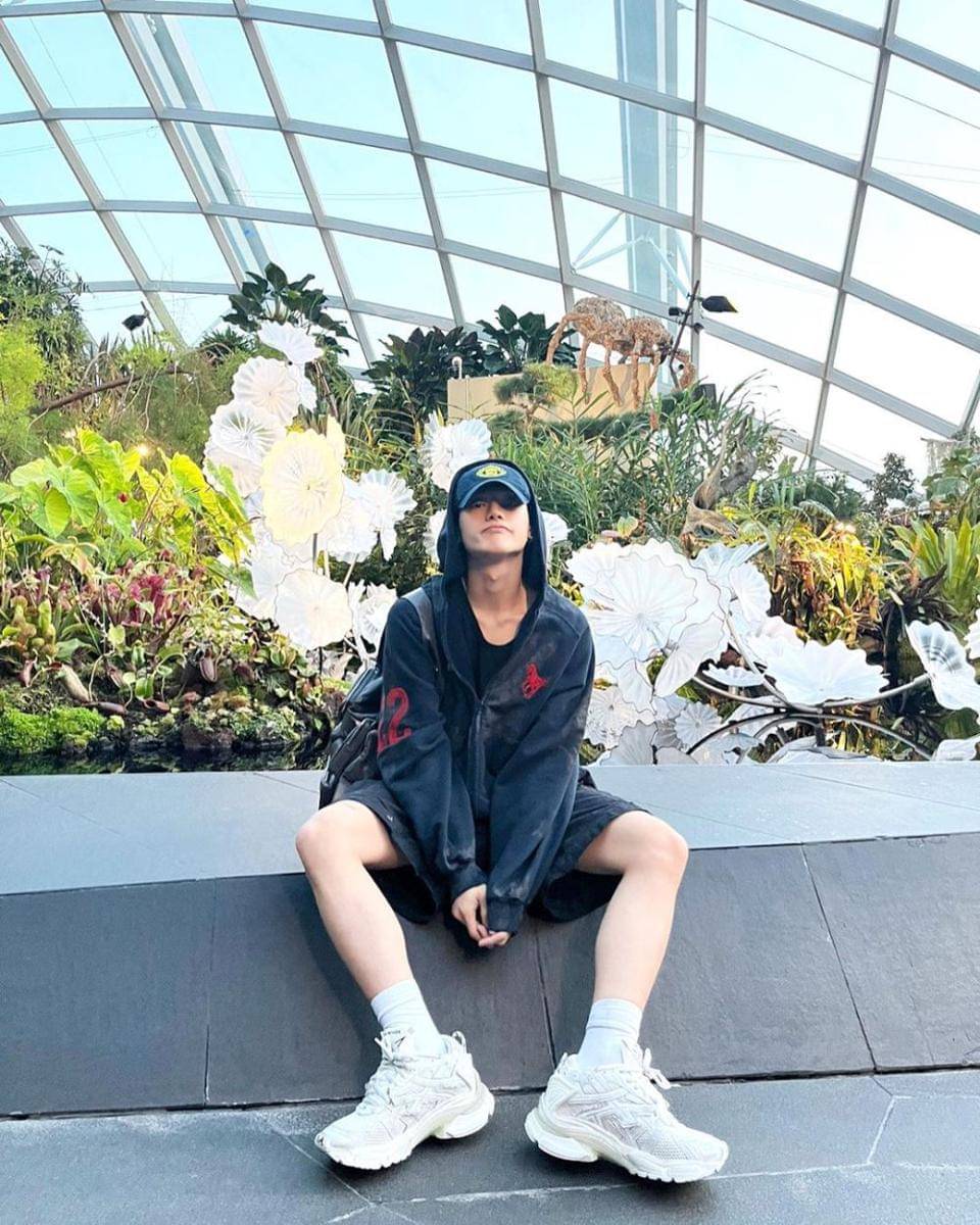 2. Untuk outfit liburan yang santai, Wooyoung memadukan kemeja fannel yang ditumpuk dengan crop top sweatshirt, cargo pants dan beanie hat