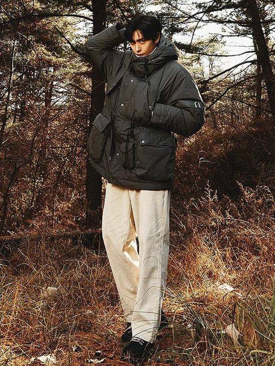 5. Cozy buat cuaca dingin, Kim Young Dae tunjukkan hooded puffer jacket abu tua, long pants, dan sneakers senada. Hangat seharian!