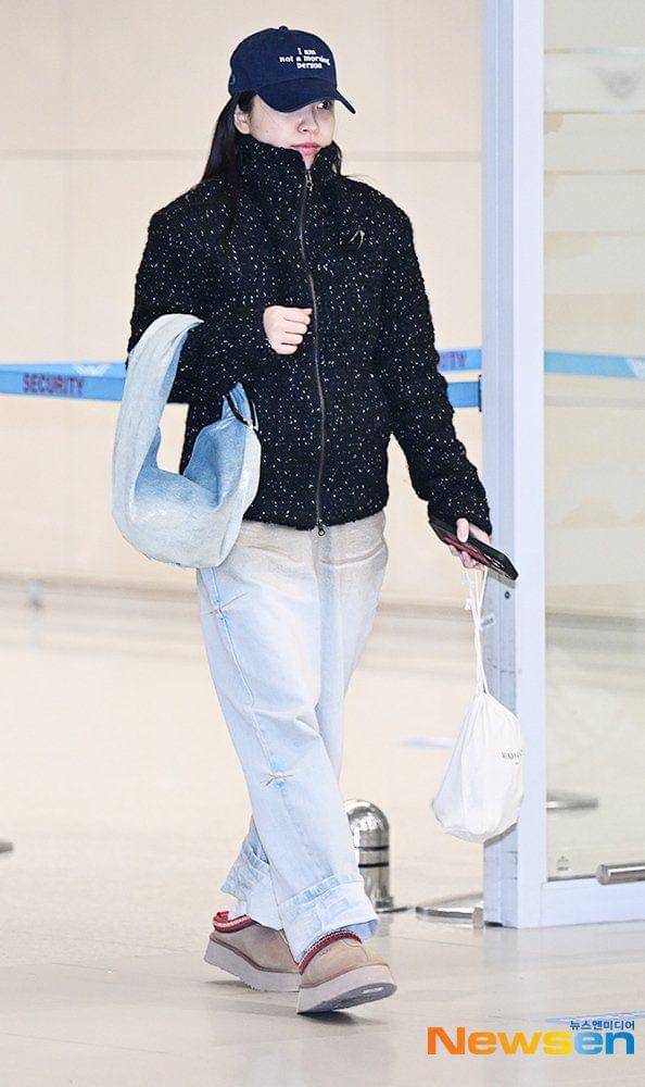 8. Inner t-shirt, Minji layer pakai swoosh puffer jacket dengan flare cargo pants, winter boots serta boho bag