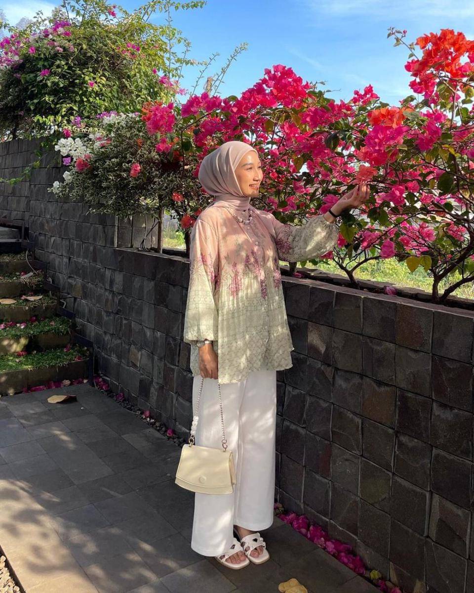 6.Tampil sederhana, Risa memadukan blouse pattern berwarna sage dengan long pants putih, ditambah sling bag dan sandals