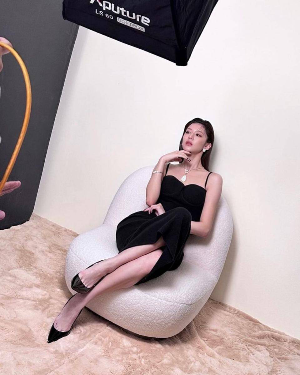 1. Pertama, ada Go Youn Jung tampil stunning dalam balutan strap dress velvet dan pointed heels hitam. Ia juga memakai aksesori yang berkilau