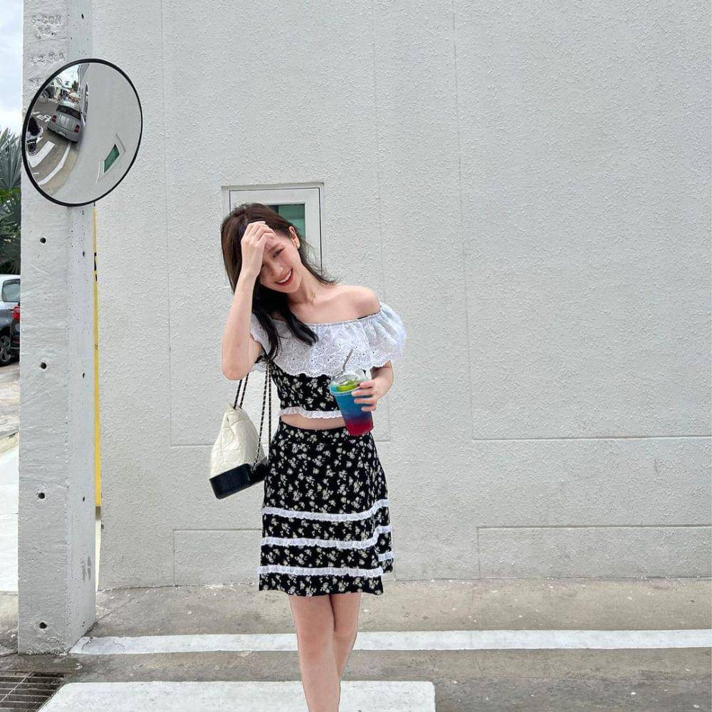 11. Untuk tampilan yang girly, pilihlah one set sabrina top aksen renda dan ruffle skirt floral ala Jane di bawah ini!