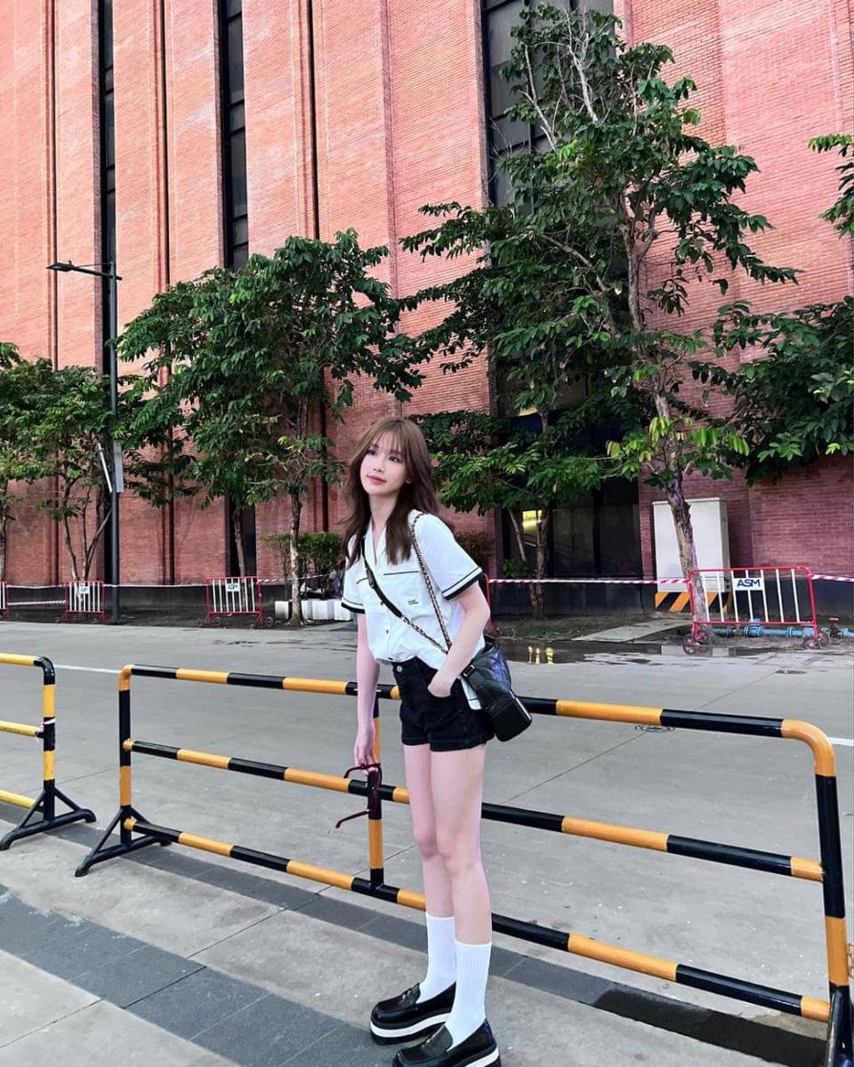 8. Gaya OOTD traveling yang fashionable, Jane memakai crop top, mini skirt, topi baret, knit socks, loafers, dan sling bag serba hitam putih