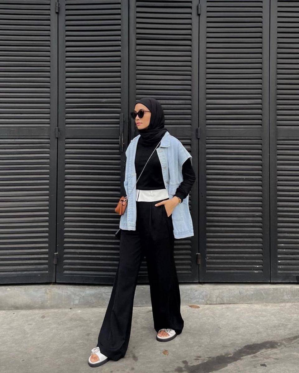 9. Wide leg pants dengan atasan manset dan rompi denim serta strap sandal bisa jadi ide OOTD yang on point buat pergi ke mall