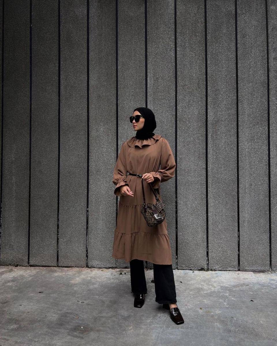 3. Gaya feminin yang stunning memakai black jeans dengan tunik ruffle bertingkat dan slip on heels. Handbag sebagai penunjang penampilan