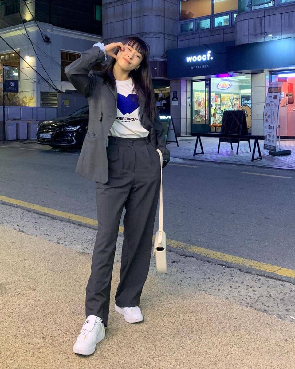 9. Kamu juga bisa padukan kaos dengan outfit one set berupa suit dan capri pants warna abu-abu serta sneakers, kece banget!