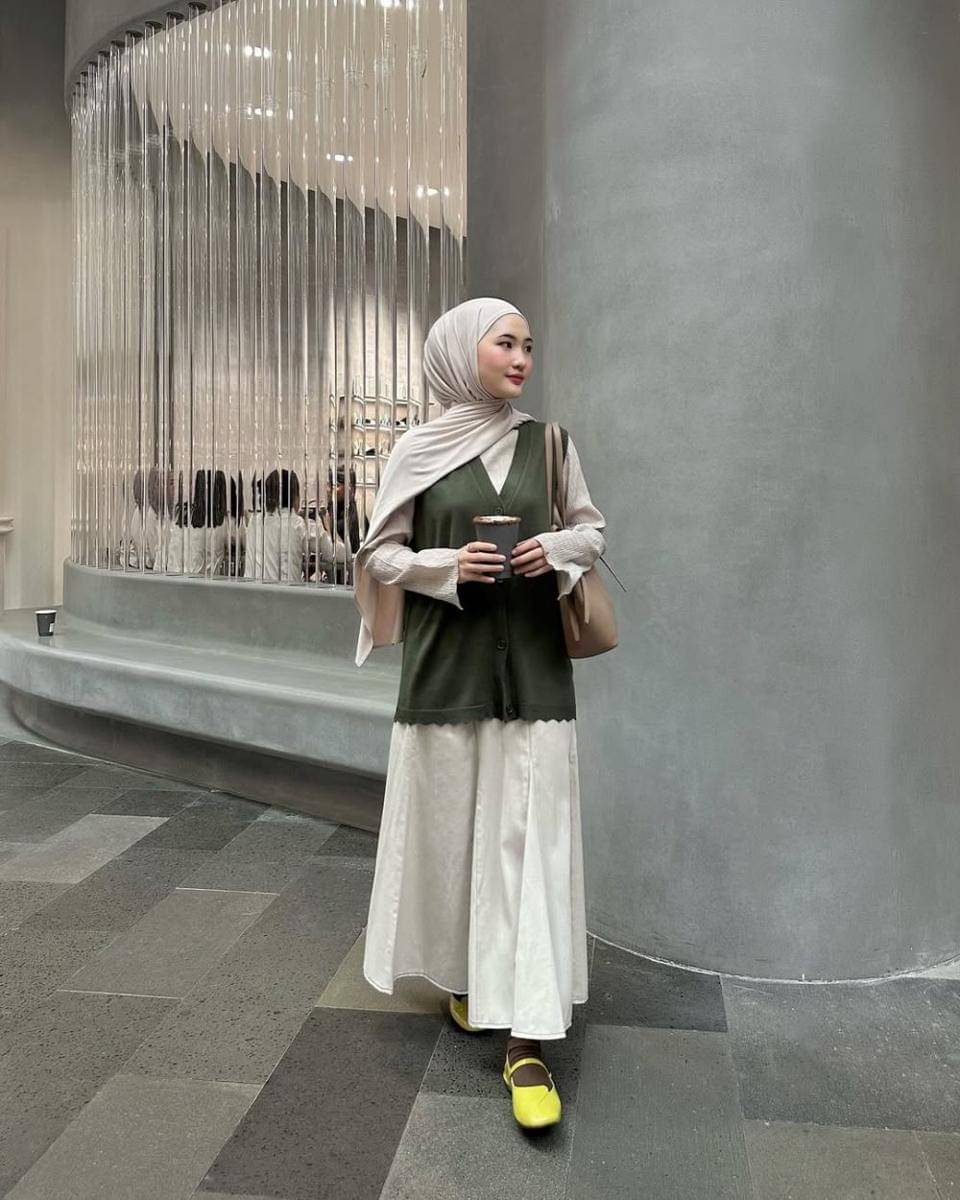 6. Go monokrom! Agar knit top kamu terlihak lebih rapi, coba padukan dengan vast warna cokelat yang senada dengan warna hijab