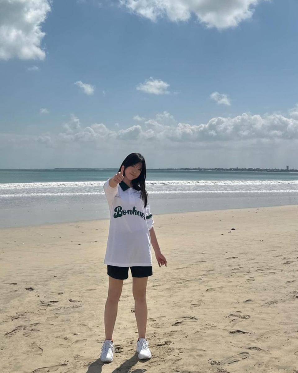 1. Bergaya di pinggir pantai, Gracie kenakan rugby shirt putih, short pants hitam, dan sneakers putih. Trendi abis, nih