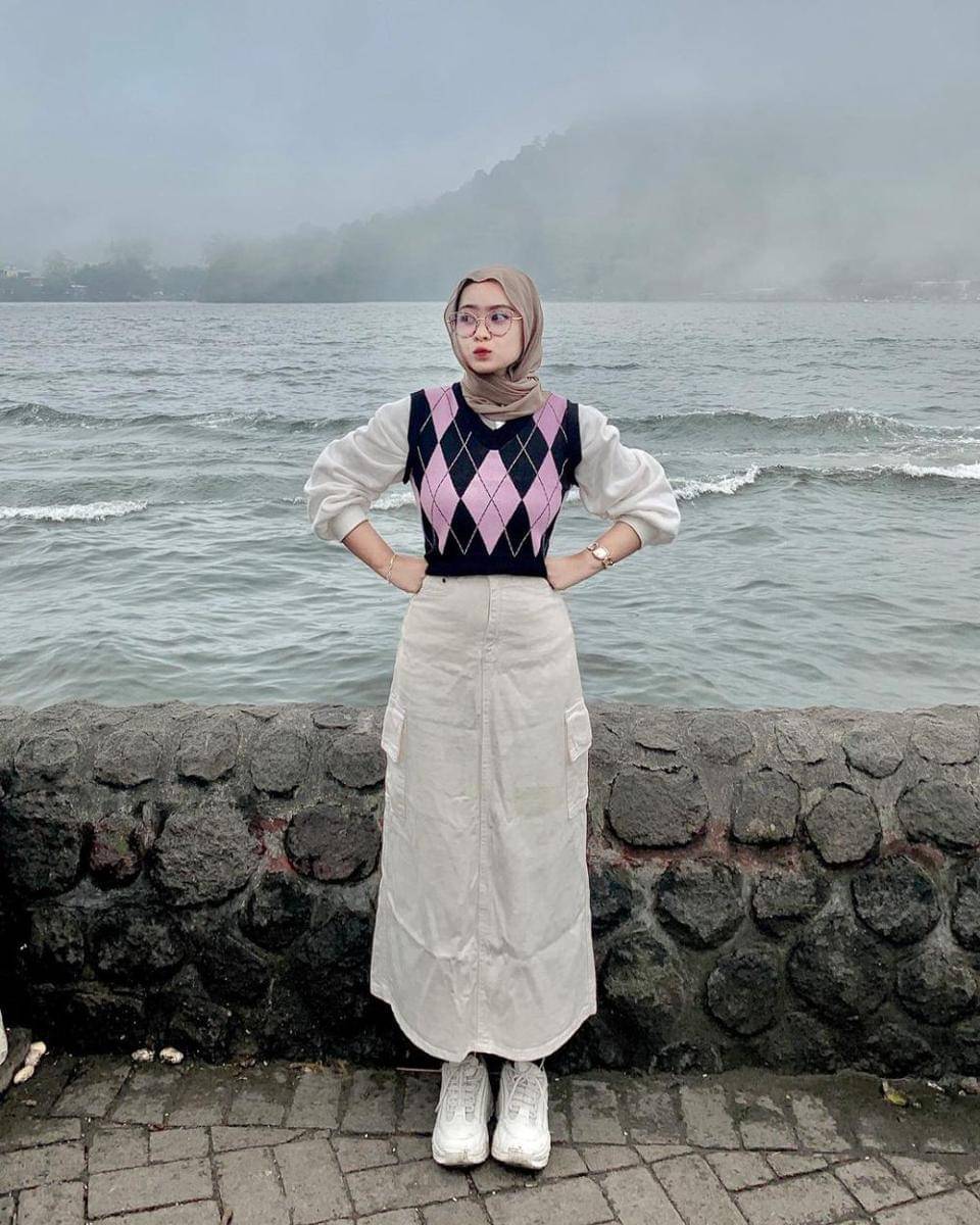 7. Tampil clean juga kekinian dengan padanan cargo skirt, long sleeve, serta vest. Selanjutnya, kenakan sneakers putih biar lebih modis