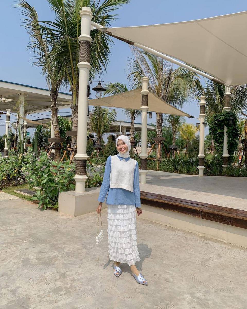 7. Inspirasi gaya liburan yang fresh, coba padukan kemeja warna biru, vest rajut dan ruffle skirt serba putih, juga mules shoes silver metalic