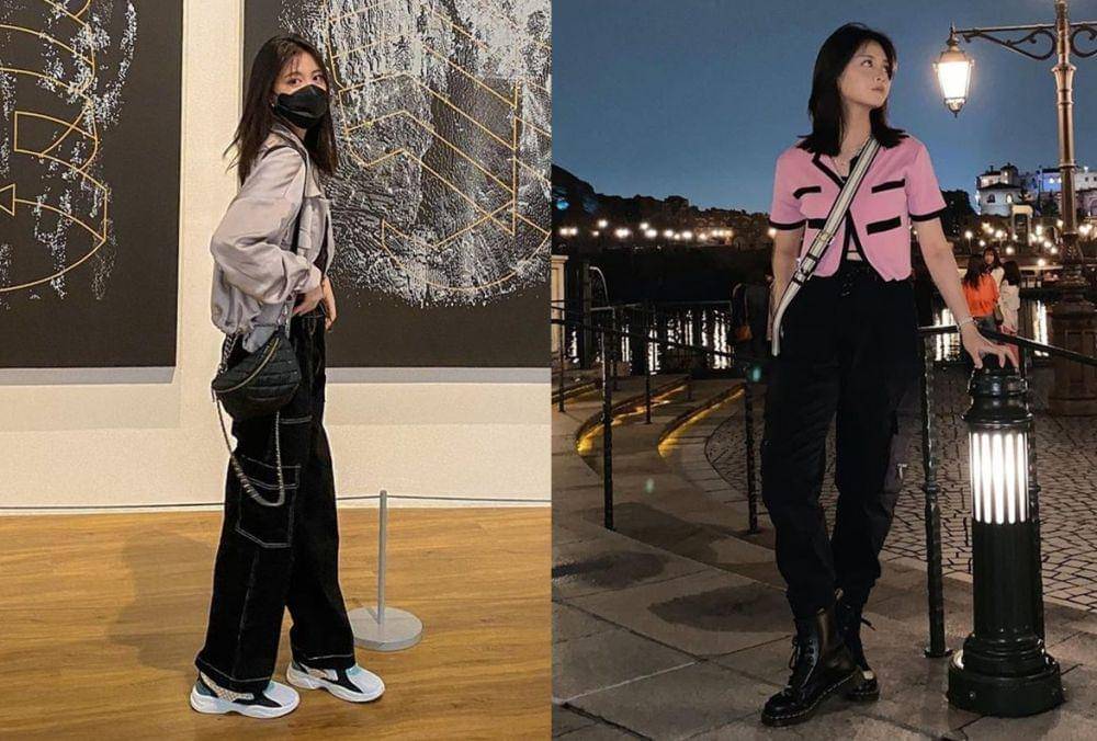 2. Christy tampil edgy dengan memadukan crop cardigan warna pink, cargo pants hitam, dan boots hitam. Kamu tertarik coba?