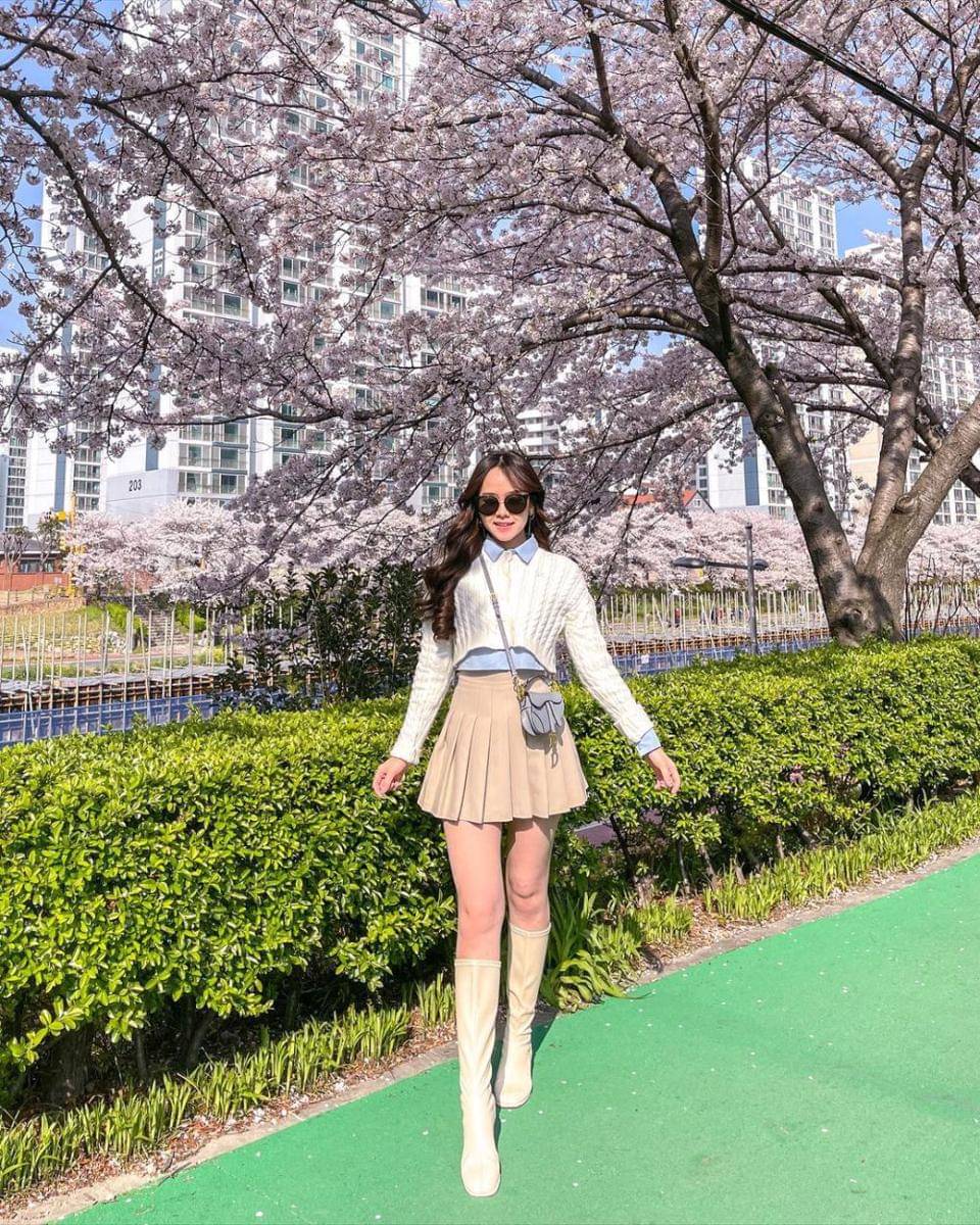 5. Untuk smart casual look, coba layering basic shirt dengan knit cable sweater. Lalu, padukan dengan mini pleated skirt dan long boots kayak begini