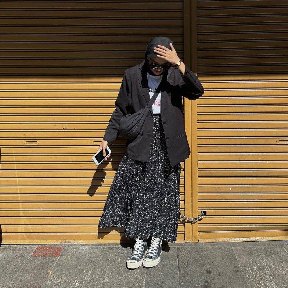 5. Lebih feminin dengan mengenakan rok motif yang flowy, kaus dan blazer. High sneaker jadi penyempurna paling tepat, deh