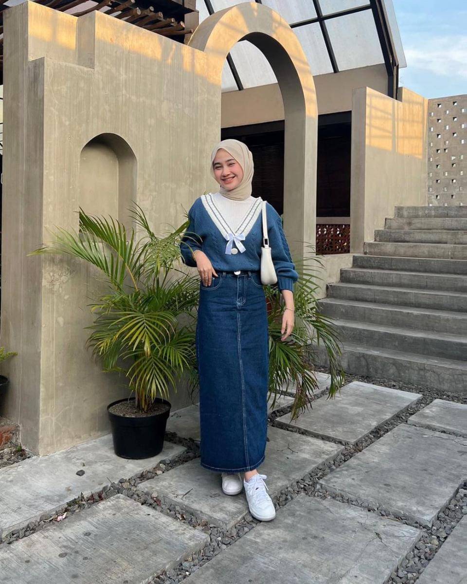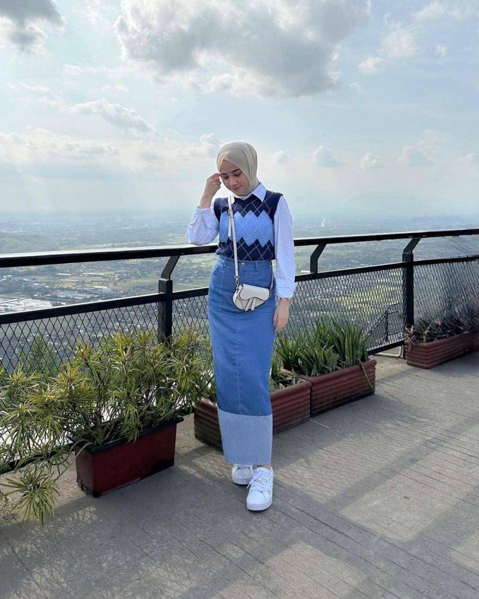 6. Kombinasi gaya smart casual basic shirt, vest rajut argyle, rok denim two tone, dan sneakers satu ini juga gak kalah modis buat kuliah, lho!