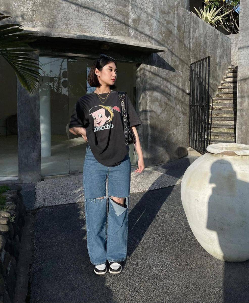 2. Kalau lagi mager padu padan, kenakan ripped jeans dan kaus pendek oversized saja. Simpel dan praktis banget, bukan?