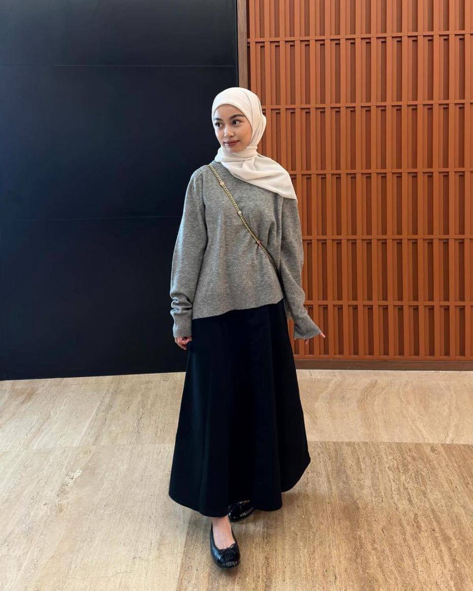 3. Tampil kece dengan outfit monokrom, Tsana kenakan knit shirt grey, hijab square broken white, serta a-line skirt dan flatshoes hitam