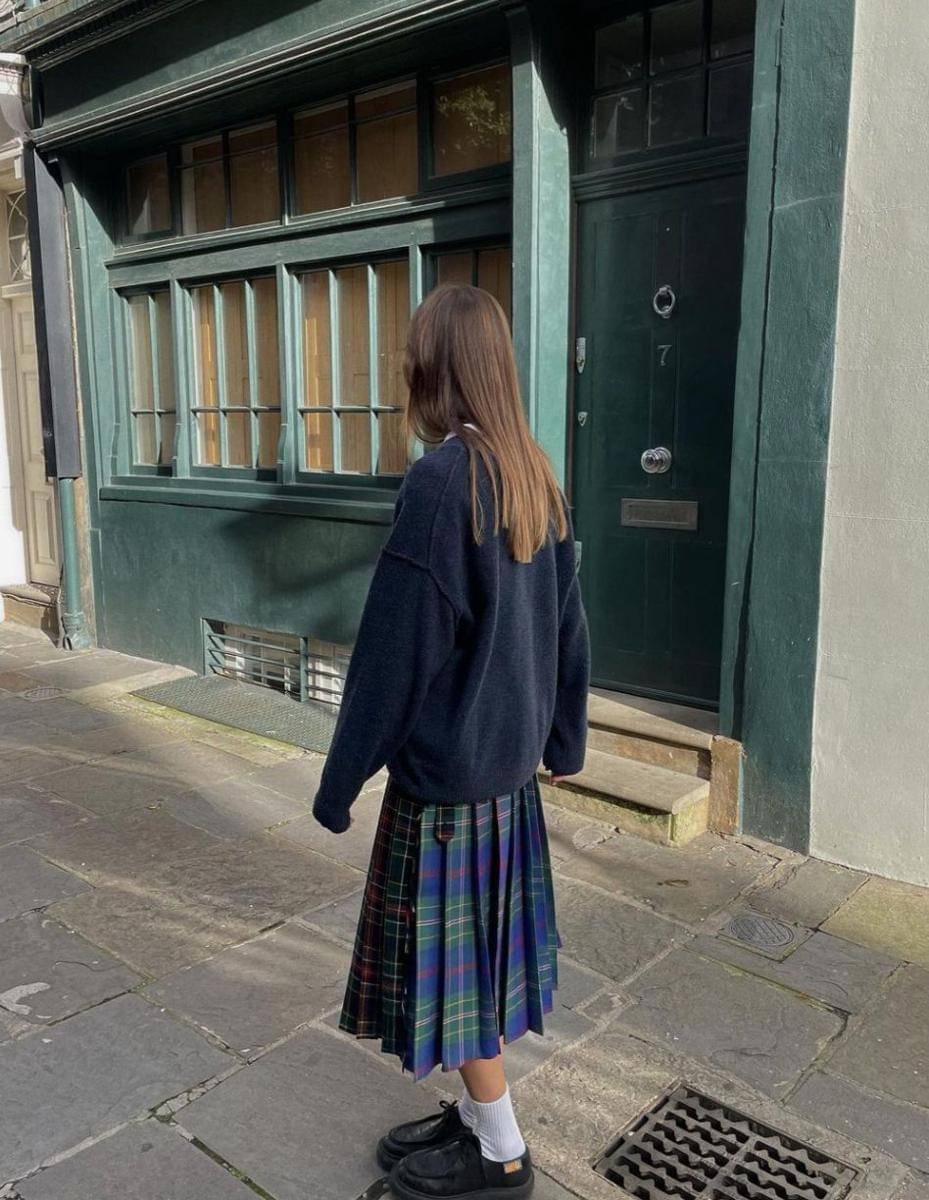 6. Untuk jalan-jalan, Poppy Almond memakai midi skirt kotak-kotak dengan sweater rajut seperti ini