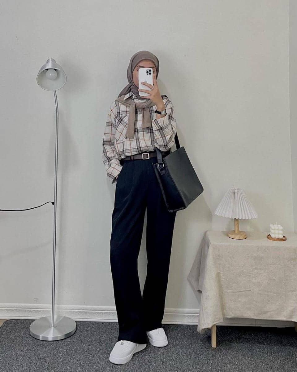 4. Untuk semiformal look, pakai inner, outer tweed, long pants, dan hijab yang dililit. Platformnya bisa pilih stiletto heels
