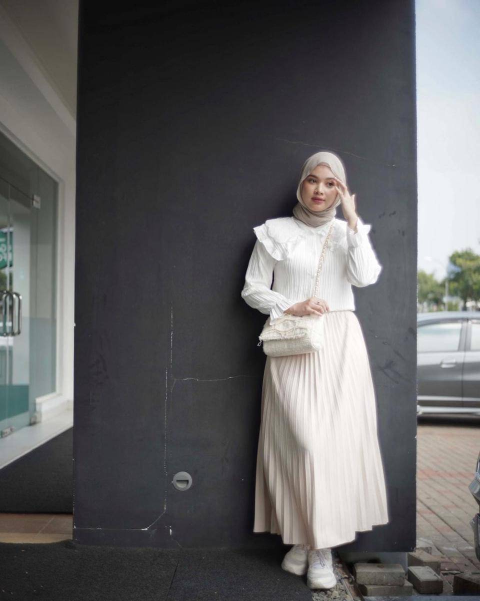 7. Kalau OOTD hijab yang satu ini cocok banget buat pergi ke kampus. Atasan putih dipadupadankan dengan rok plisket