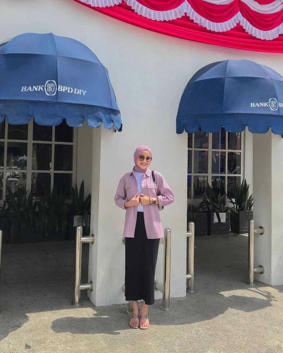 8. Memadukan kemeja lavender dengan rok span bikin tampilan makin elegan benget
