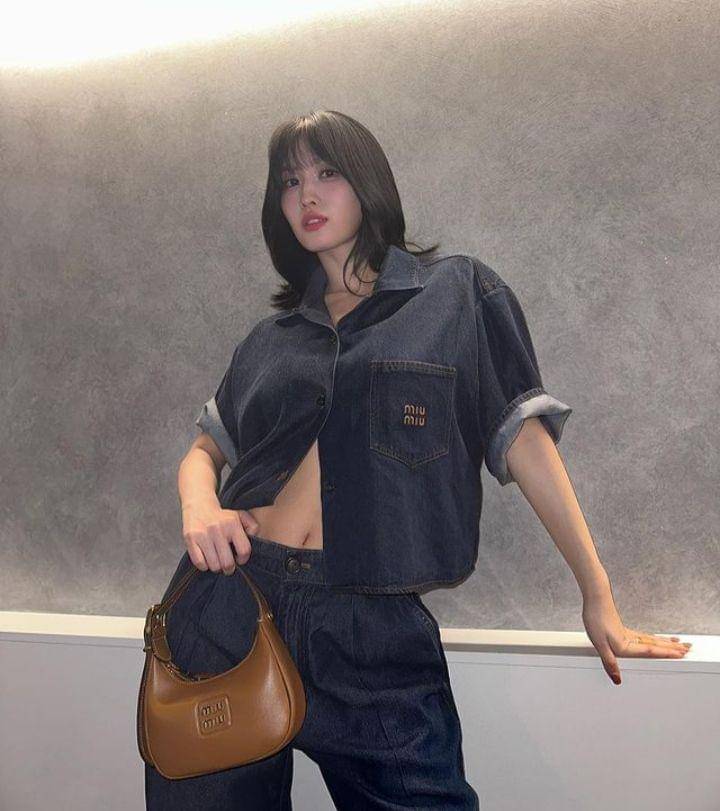 1. Simple style! Disini Momo mengenakan setelan denim on denim berupa denim shirt serta denim pants yang dipadukan dengan shoulder bag