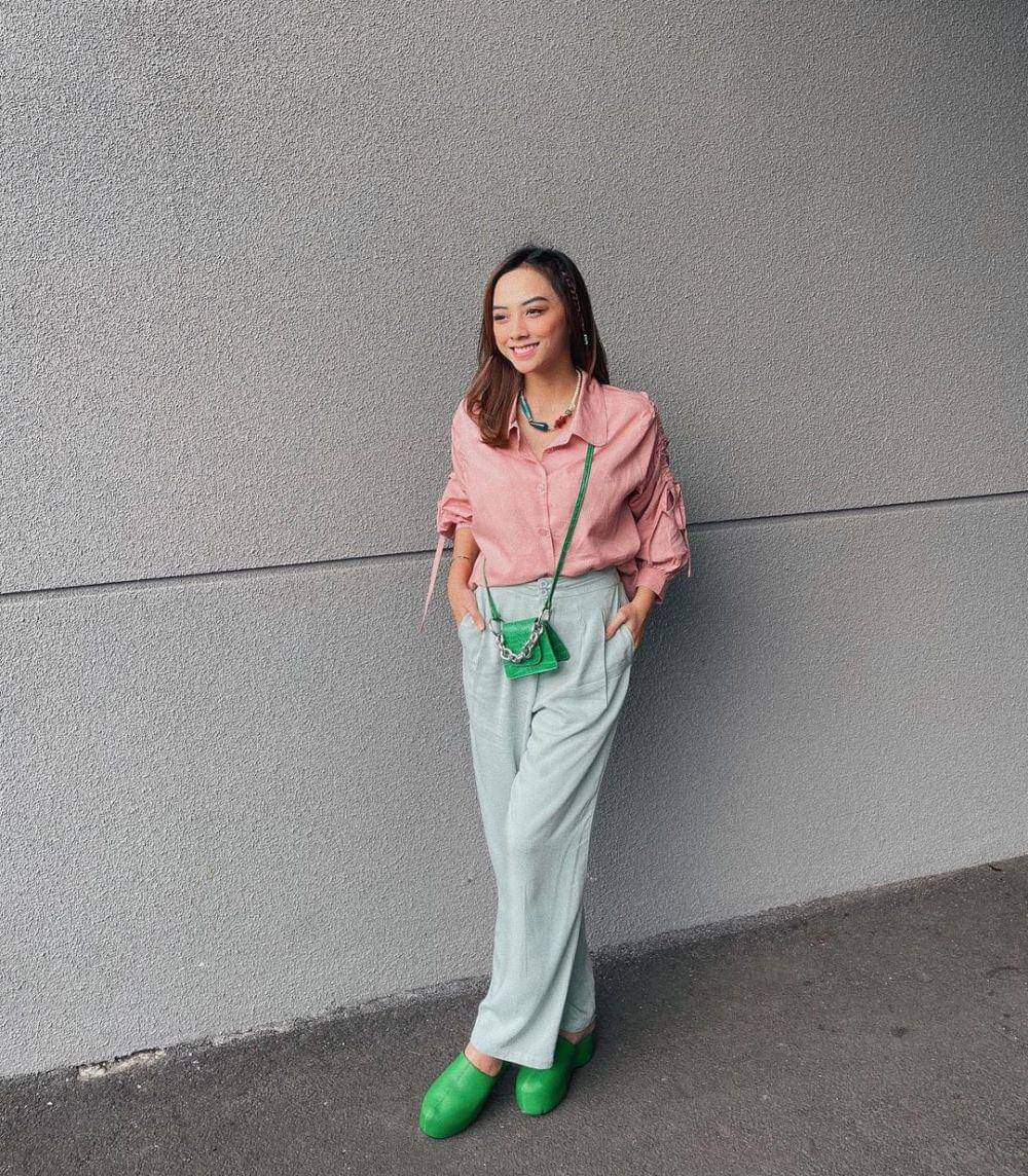 11. Hadirkan konsep tabrak warna, Azaria memakai long sleeve drawstring pink pastel, casual pants tosca, mules shoes, dan sling bag hijau