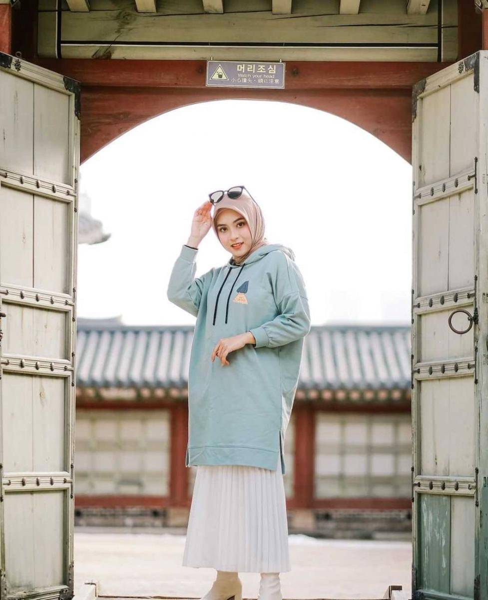 8. Gak melulu girly, kamu bisa padukan hijab warna mocca, oversized sweater, rok plisket putih, dan juga ankle boots dengan warna senada untuk tampilan yang lebih boyish