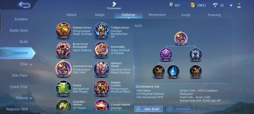 Atribut unik yang dimiliki dari item ini akan membuat skill Esmeralda lebih cepat dalam cooldownnya. Dan dengan pasif unik – artic cold yang dimiliki dari item ini membuat shield dan Hp regen hero lawan berkurang 50% dari yang mereka miliki begitu juga untuk attack speednya dan pasif ini akan aktif jika hero kita berdekatan dengan hero musuh sehingga cocok untuk Esmeralda yang memiliki mobilitas yang tinggi.